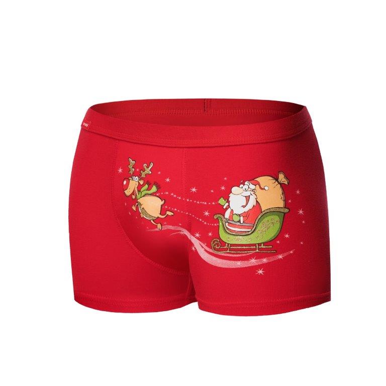 Męskie bokserki firmy Cornette w kolorze czerwonym z zabawną świąteczną aplikacją św. Mikołaja jadącego na saniach. Bokserki z krótką nogawką, delikatnie opinające ciało. Bezuciskowe wykończenie nogawek, płaskie szwy, guma w czerwonym tunelu, przestrzenny klin.