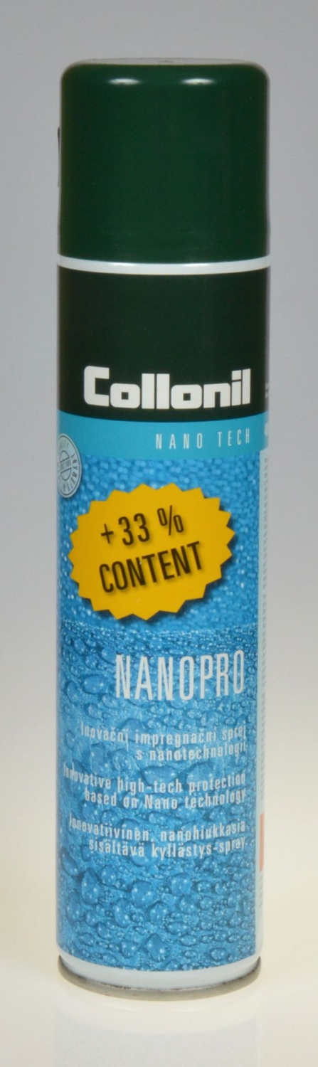 Preparat firmy Collonil Nanopro to neutralny aerozol impregnujący. Produkt można stosować do wszystkich rodzajów materiałów, takich jak skóry gładkie, nubuk, welur oraz tekstylia.Dzięki zastosowaniu technologii nano spadająca na powierzchnię kropla wody zabiera ze sobą cząsteczki brudu i kurzu nie wnikając do niej. Preparat zapobiega powstaniu plam, zacieków oraz smug zachowując jednocześnie przewiewność materiału. Przy regularnym jego stosowaniu powierzchnia skóry lub materiału dłużej wygląda jak nowa.