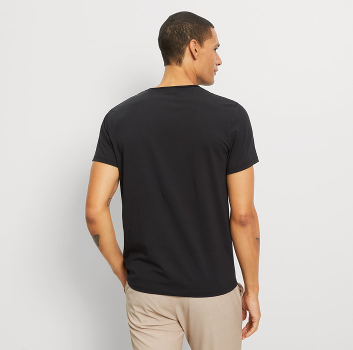 Klasyczny t-shirt firmy Olymp z krótkim rękawem w kolorze czarnym. T-shirt wykonany został z delikatnej bawełny jersey o lekkiej elastyczności, która doskonale współpracuje z ciałem. Dodatkowo posiada właściwości termiczne. Dzięki okrągłemu dekoltowi podkoszulek ten to idealny element ubioru na lato oraz do noszenia pod koszulę czy też sweter.