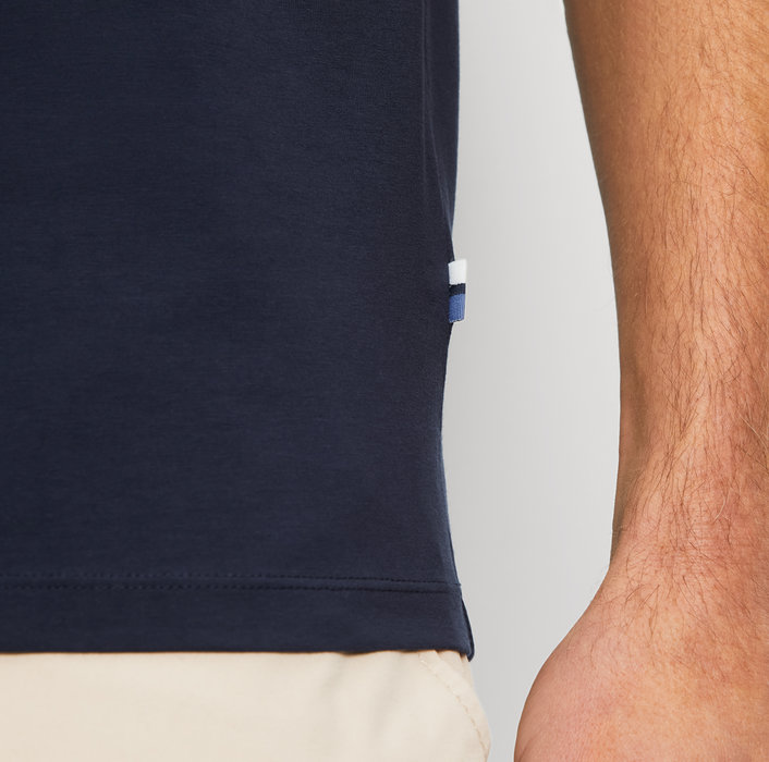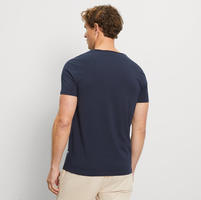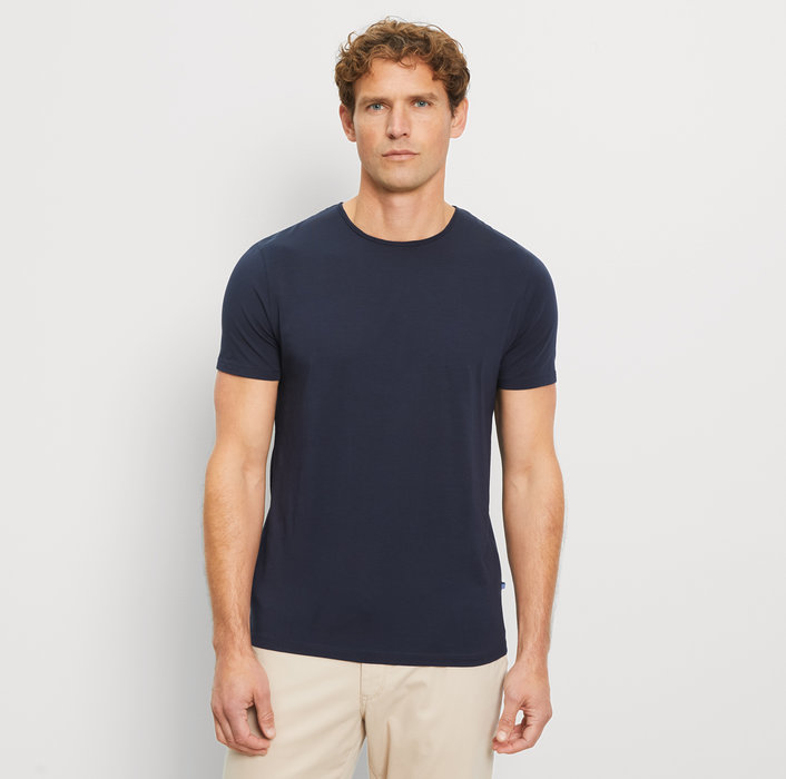 Klasyczny t-shirt firmy Olymp z krótkim rękawem w kolorze granatowym. T-shirt wykonany został z delikatnej bawełny jersey o lekkiej elastyczności, która doskonale współpracuje z ciałem. Dodatkowo posiada właściwości termiczne. Dzięki okrągłemu dekoltowi podkoszulek ten to idealny element ubioru na lato oraz do noszenia pod koszulę czy też sweter.