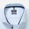 Opis:Koszula firmy Olymp z długim rękawem w drobne, niebieskie paski. Niewymagająca prasowania koszula Olymp wykonana została z wysokogatunkowej bawełny non-iron. Koszula z mankietem na guziki z możliwością regulacji (2 guziki, 1 dziurka). Koszula posiada ozdobne guziki w kolorze granatowym oraz ozdobny, wzorzysty kontrast po wewnętrznej stronie kołnierzyka oraz mankietów. Sylwetka Modern Fit. Kołnierz New Kent. Koszula nie posiada kieszonki na piersi.