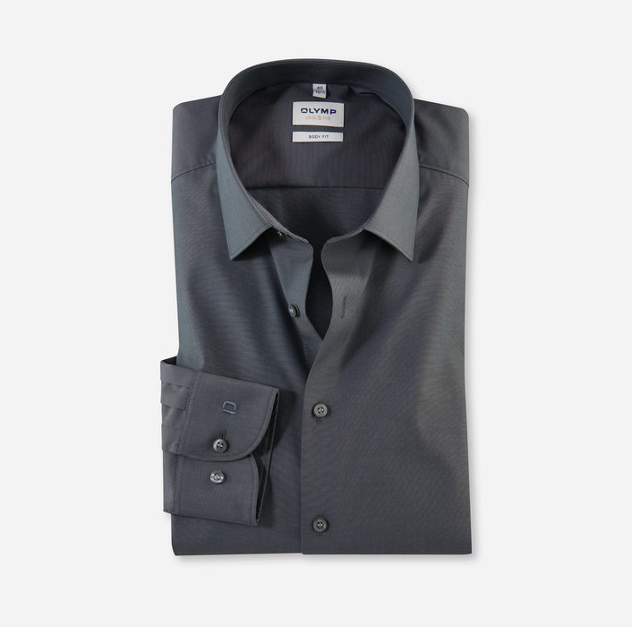Koszula męska firmy Olymp z długim rękawem w kolorze grafitowym. Mankiet zapinany na guziki z możliwością regulacji (2 guziki, 1 dziurka). Koszula jest łatwa w prasowaniu, oddychająca, elastyczna. Kołnierz New York Kent. Krój przylegający do ciała- Slim (body fit).