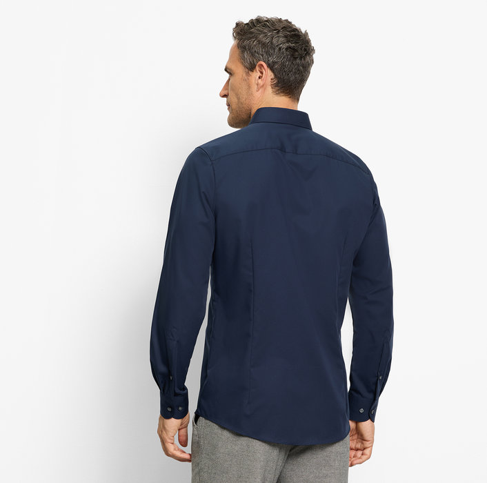 Opis:Granatowa, gładka koszula firmy Olymp z długim rękawem. Koszula nie posiada kieszonki na piersi. Koszula wykonana została z bawełny, dzięki właściwościom natural stretch pracuje razem z ciałem. Mankiet zapinany na guziki z możliwością regulacji (2 guziki, 1 dziurka). Krój koszuli przylegający do ciała, na plecach zaszewki podkreślające linię talii - Slim (body fit). Kołnierz New York Kent.