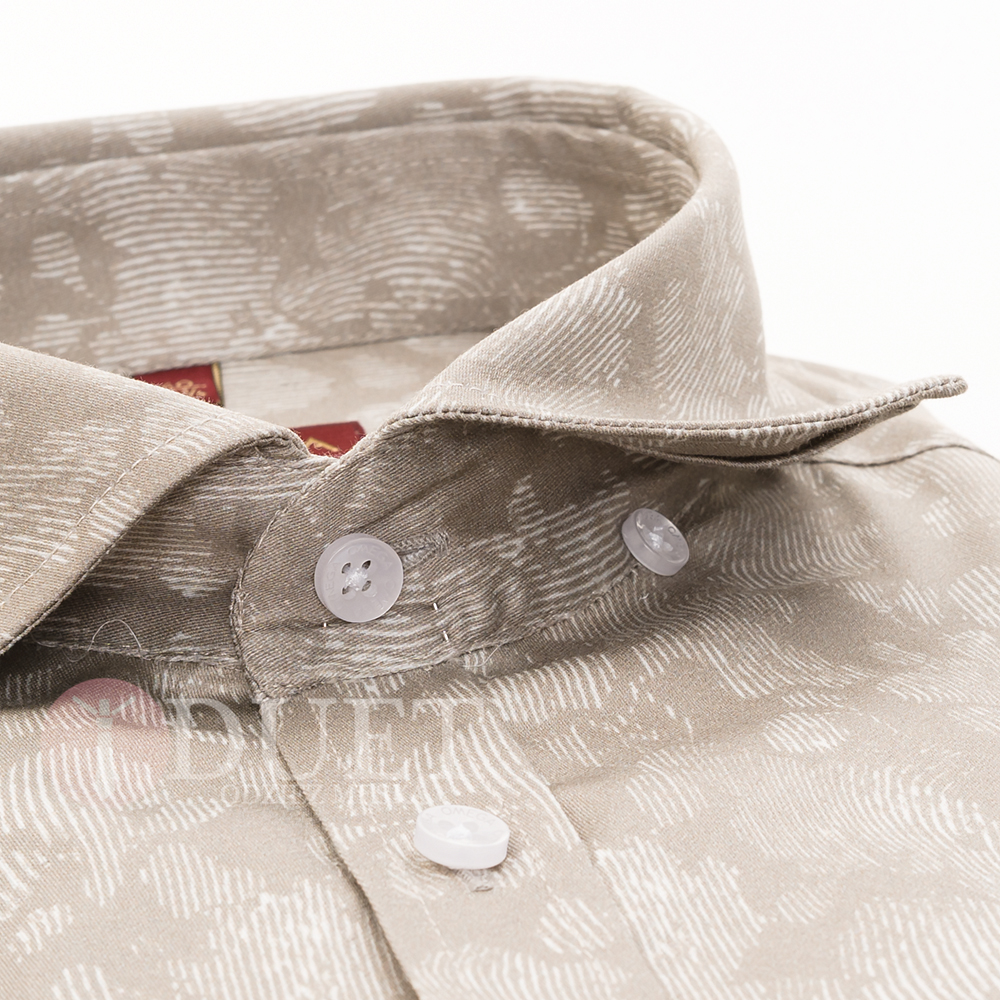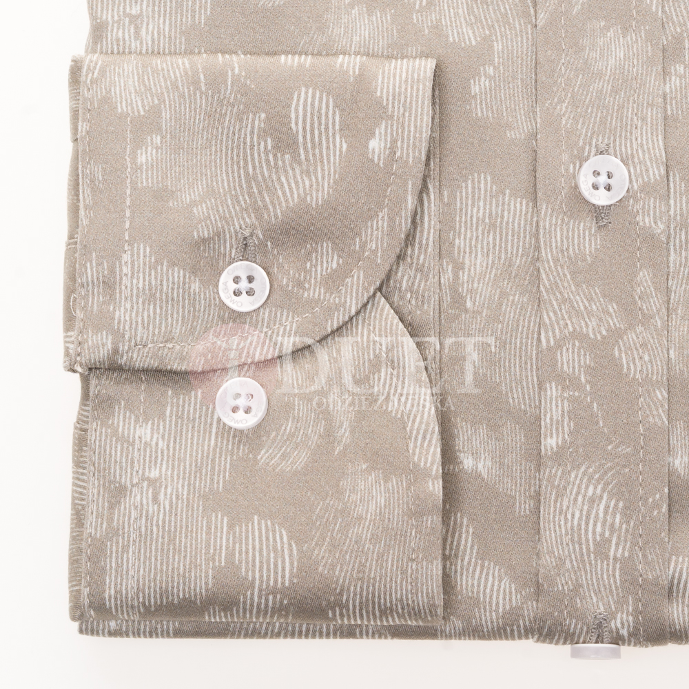 Casualowa, wyjątkowa koszula z długim rękawem firmy Omega w beżowym kolorze ozdobiona białym wzorem. Koszula nie posiada kieszonki na piersi. Kołnierz Kryty Button- Down. Mankiet zapinany na guziki z możliwością regulacji (2 guziki, 1 dziurka). Koszula posiada zaszewki na plecach podkreślające linię talii. Krój przylegający do ciała - Slim Fit.