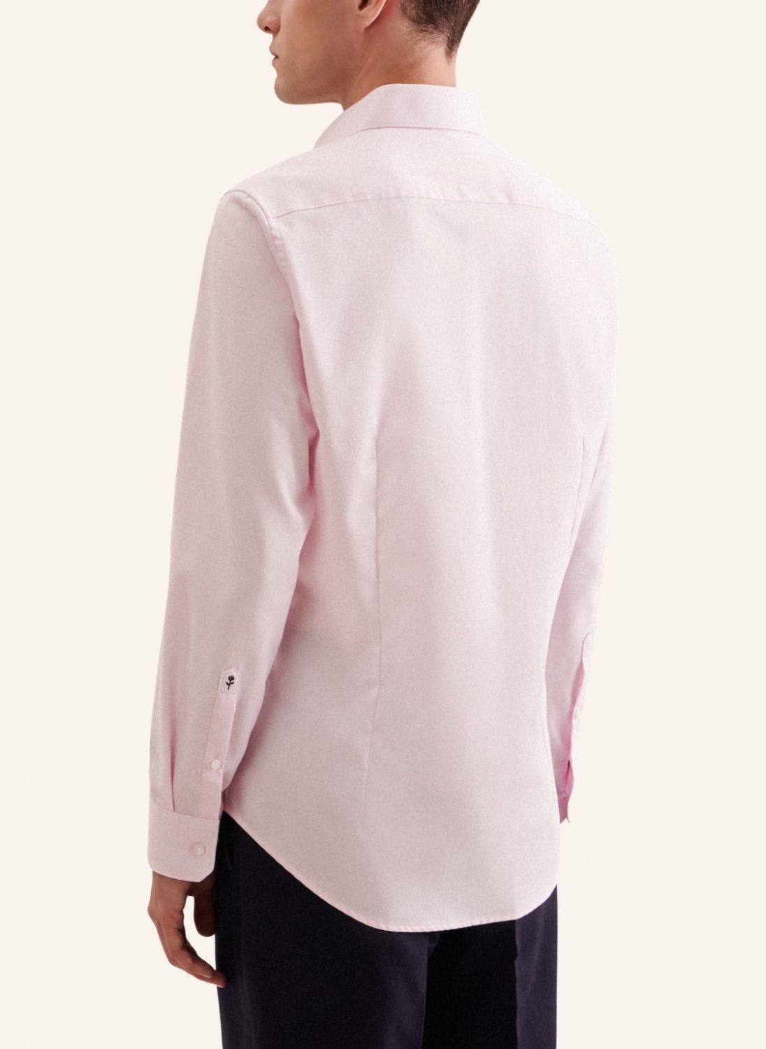 Gładka koszula niemieckiej firmy Seidensticker w kolorze jasnego różu z długim rękawem. Mankiet zapinany na guziki z możliwością regulacji (2 guziki, 1 dziurka). Koszula wykonana została z wysokiej jakości tkaniny bawełnianej niewymagającej prasowania. Krój shaped. Koszula posiada na plecach zaszewki podkreślające linię talii. Kołnierz Włoski.