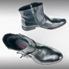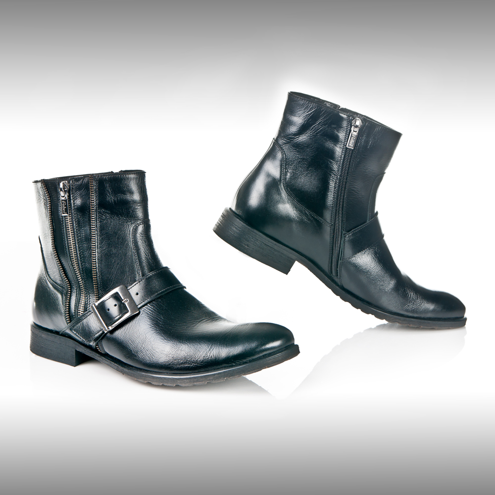Czarny, ocieplany kozak męski z suwakami po bokach. Z przodu buta ozdobny pas z klamrą.