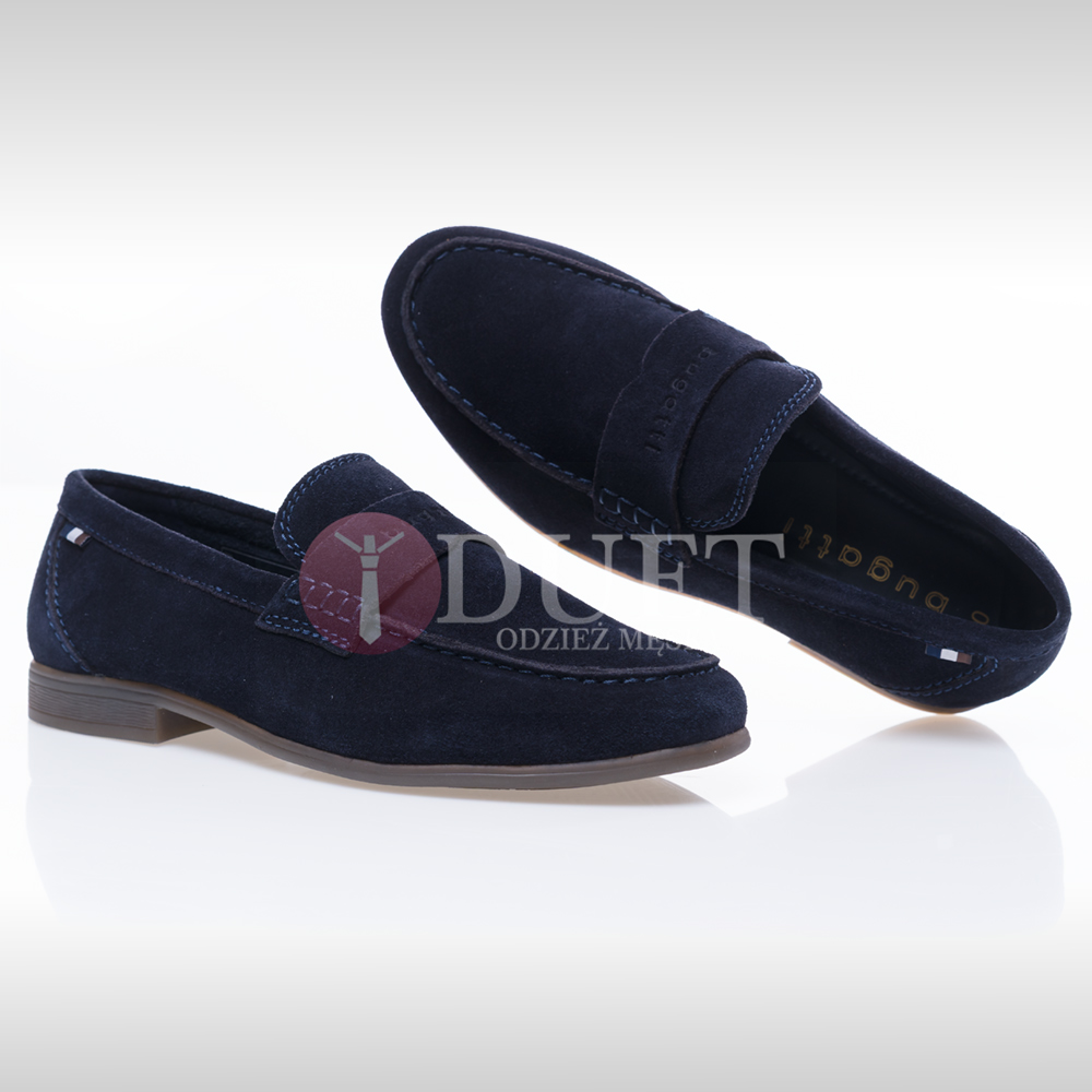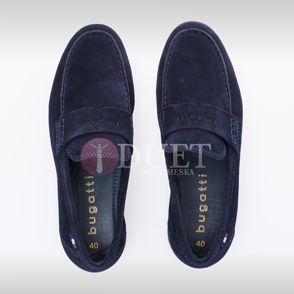 Męskie mokasyny firmy Bugatti zostały wykonane ze skóry zamszowej w kolorze granatowym na gumowej, brązowej podeszwie. Na wierzchu buta znajduje się ozdobny pasek z logo firmy, także w kolorze granatowym. Buty idealne do eleganckich oraz casualowych stylizacji. Wysokość obcasa 2 cm. Mokasyn nie posiada wyjmowanej wkładki. Wkładka wypełniona jest pianką "memory foam" która podnosi komfort chodzenia.