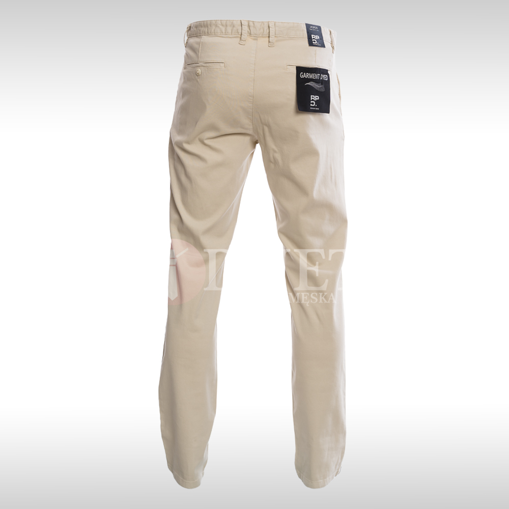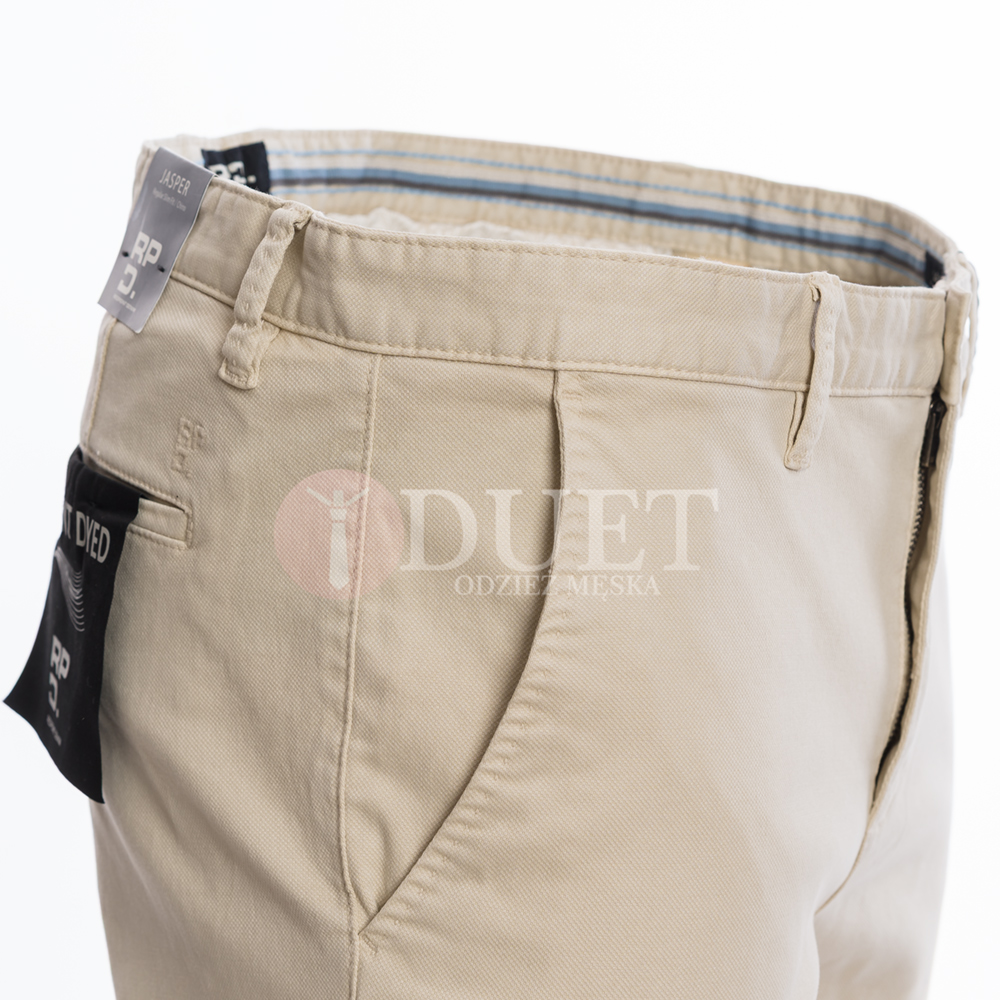 Bawełniane spodnie typu chinos firmy Redpoint w kolorze jasnego beżu zapinane na zamek. Uszyte zostały z wysokiej jakości bawełny z dodatkiem elastanu dzięki czemu lepiej dopasowują się do ciała. Kontrastowe obszycie spodni po wewnętrznej stronie. Po wewnętrznej stronie spodni znajduje się także taśma utrzymująca np. koszulę w spodniach. Spodnie świetnie wyglądają ze swetrem, koszulą, koszulką polo lub marynarką. Krój spodni- slim.